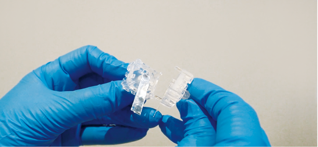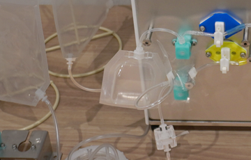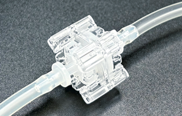 First, attach the two connectors. Next, automatically detach the aluminum seal plates attached to them while heating them with the welder. This causes the connector ends to be heat-welded. As a result, the tubing is connected in a sterile state via the connectors, enabling the flow of liquid.