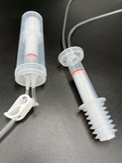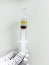 This is a syringe container for closed-type blood separators.It is sterilized with the rear opening sealed by an accordion-style cover, allowing the plunger to be moved up and down while maintaining sterility.It can be easily set into existing 50mL centrifuge tubes for convenient centrifugation.