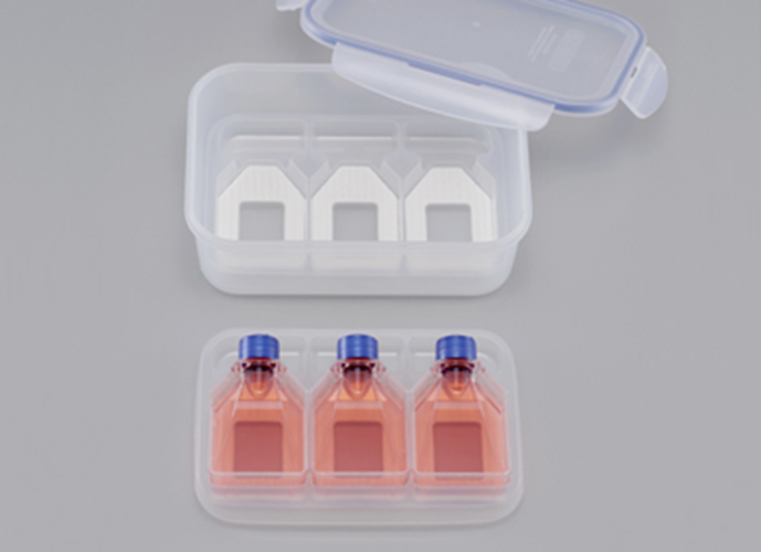 The specialized tray that matches the shape of iP-TEC® Flask-25 can be stacked in two layers and stored in the main unit, making it possible to transport up to six flasks! The main body and specialized tray are made of polypropylene and are autoclavable.